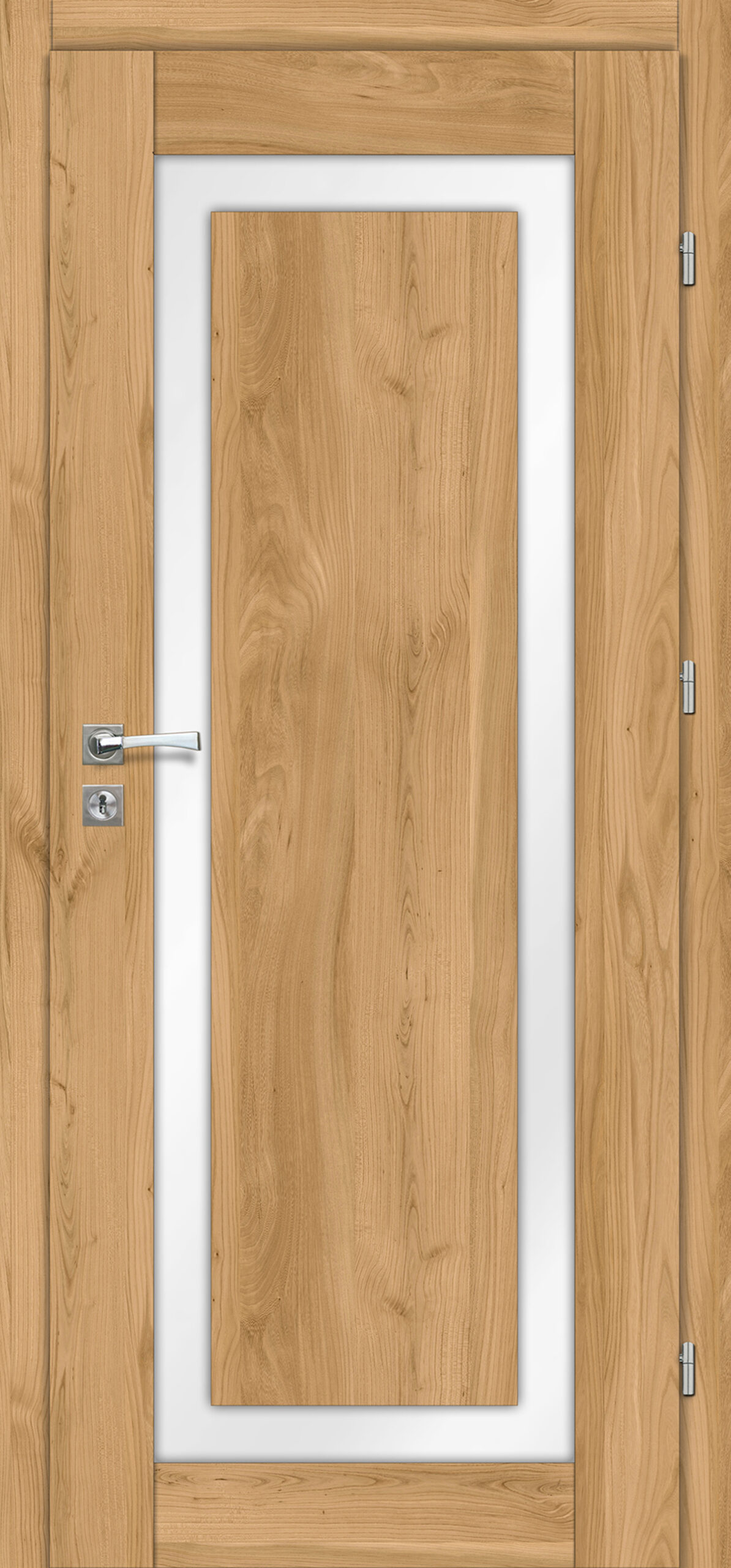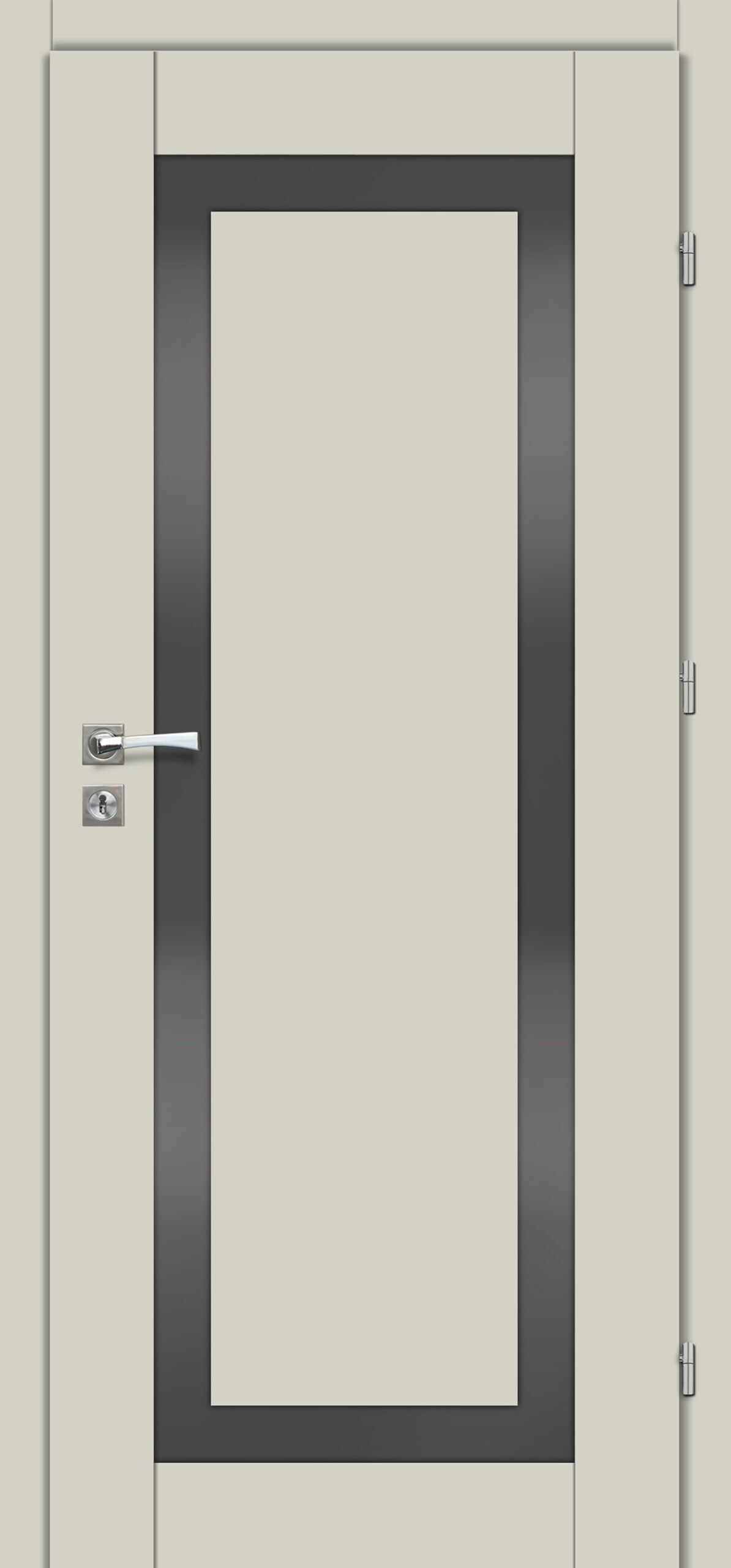 Tömör MDF szerkezetű keretes ajtószárny MDF átfogótokkal 3 betekerhető csapos zsanér Nyíló-, vagy toló-, 1 és 2 szárnyú kivitelben is A középső panel fekete pácolt lemezből készül, a panel pereme nincs szegélyezve, a panel eleje az ajtószárny színének megfelelő díszítéssel borított. Elérhető szélességek: „60”, „70”, „80”, „90” „100” Kilincs nélkül